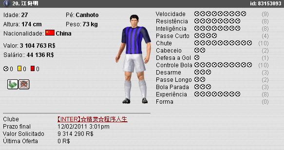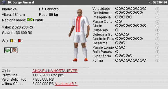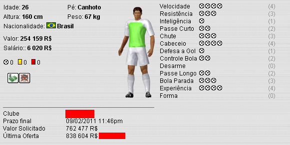 O dirigente colocou à venda este jogador pereba por R$762.477. Aí então pensei, 762.477 conto? Só pode estar louco hehehehehe...E o pior é que outro dirigente deu um lance maior que isso, R$838.604.